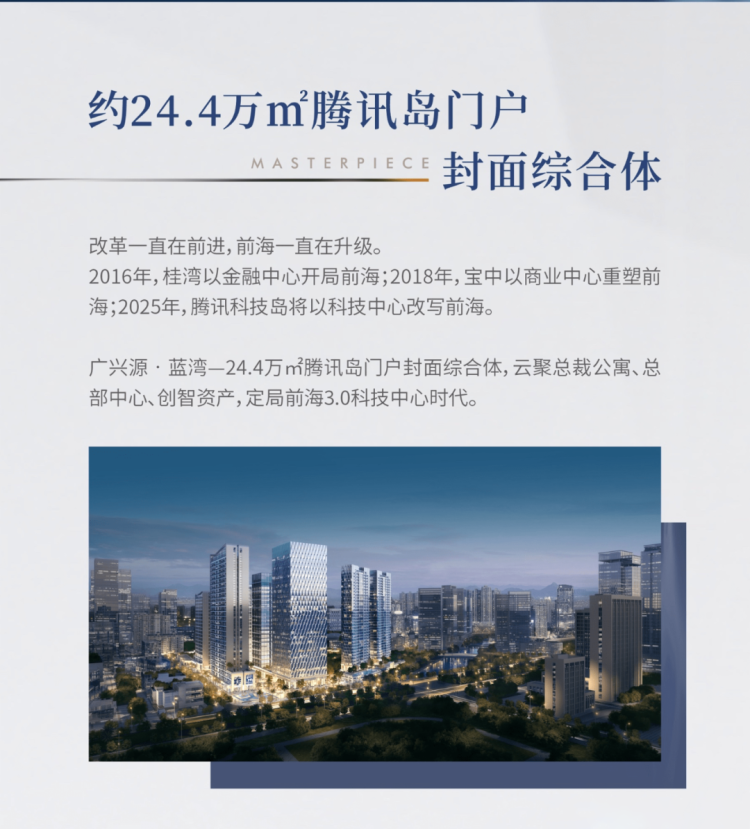 广兴源·蓝湾项目毗邻腾讯科技岛核心地段,集商务公寓、商务办公、5G智慧生活场于一身,占地面积约2.9万平方米,建筑面积约24.4万平方米,为该区域的商务综合体标杆。未来周边区域会形成一个巨大的互联网产业集群,吸引更多高端科技产业和人才。
