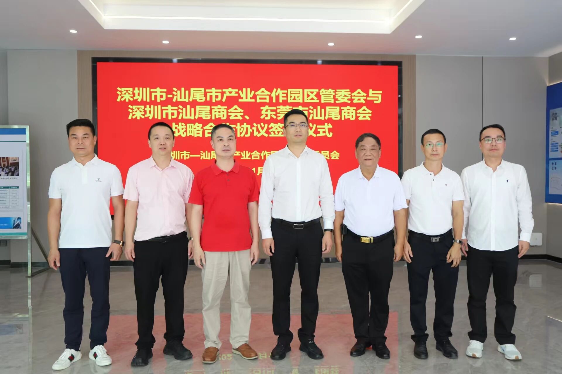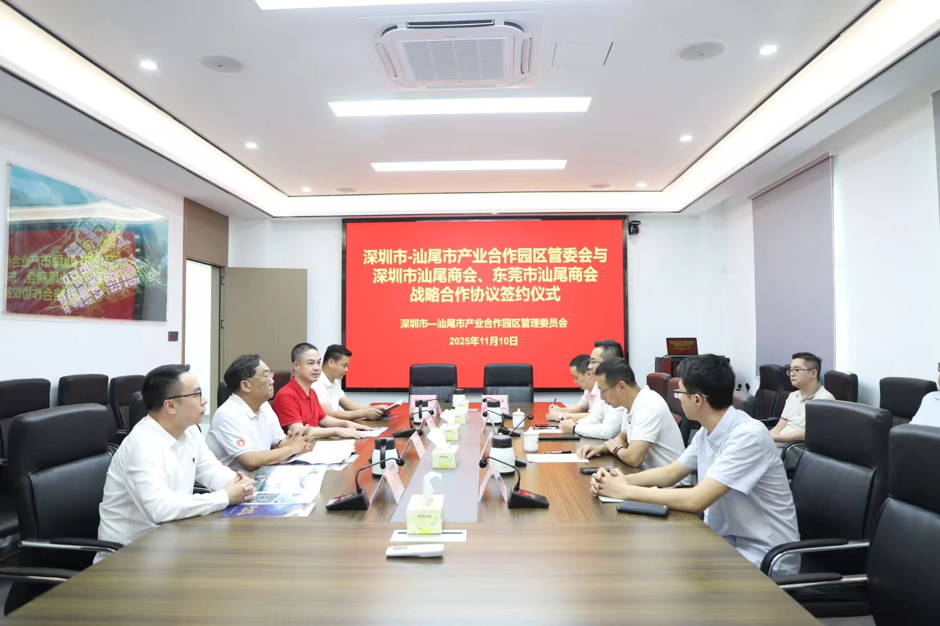11月10日,深圳市-汕尾市产业合作园区管理委员会与深圳市汕尾商会、东莞市汕尾商会战略合作协议签约仪式在汕尾市深汕合作园区隆重举行。受黄耀文会长的委托,商会特派党支部书记周伟明、执行秘书长方煜出席,其余参与人员有:深圳市对口帮扶协作汕尾指挥部副指挥长、深汕合作园区管委会主任李亚,深圳市对口帮扶协作汕尾指挥部副指挥长、深汕合作园区管委会副主任、汕尾市科技局党组成员、副局长魏汉锡,深汕合作园区管委会招商组组长曾北胜,东莞市汕尾商会会长黄俊堂、监事长吴金淡以及深汕合作园区管委会相关同志。